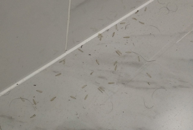上圖是在家中廁所地板上所拍攝的,經(jīng)審定都是白蟻及有翅白蟻翅膀,白蟻巢穴只要到達(dá)8年以上的成熟期,才會(huì)有有翅白蟻飛出來。每年的4-6月份有翅白蟻蟻開端分飛,目的就是為了配對(duì)繁衍,配對(duì)勝利后就會(huì)退掉翅膀?qū)ひ掃m宜的中央筑巢。